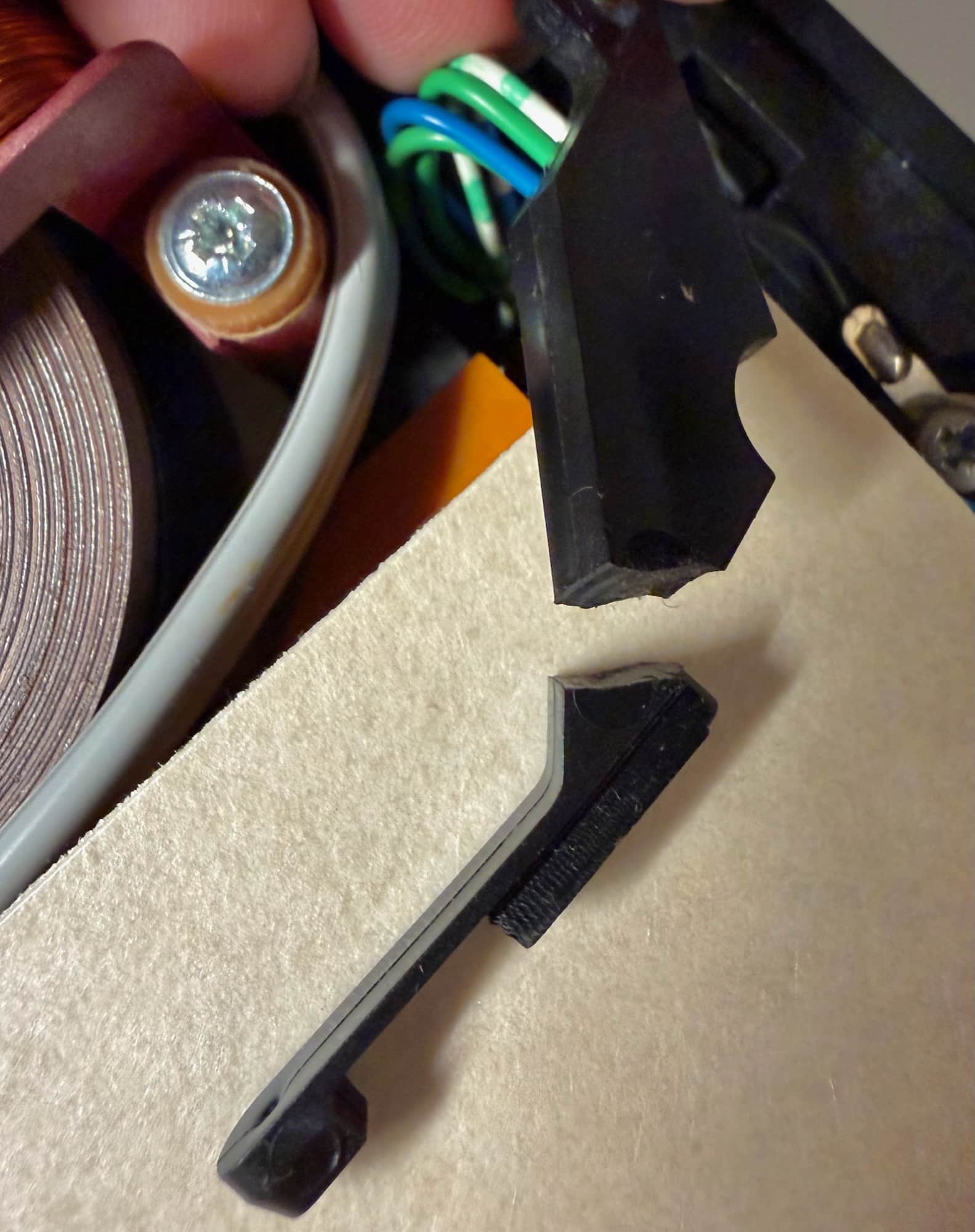 1.  The left plastic bracket that lifts the Programming panel has broken off (the part that extends into the machine itself.) In the attached photo I've fished it out of the bottom of the machine; normally it mounts to the underside of the metal lid.I'm not sure this was ever available as a spare part; the closest I can see in the service manual is the whole upper Programming area, #1005 Sekundær betjeningspanel FM-AM.I suppose the next best move is to use plastic epoxy to try to get it back together – or find a parts BeoMaster I can take one from.